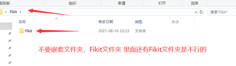 不要嵌套文件夹,不要Fikit文件夹里面还有Fikit文件夹,例如下图
